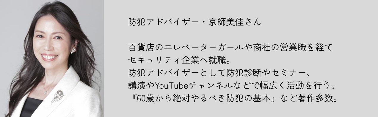 今回は、防犯アドバイザーの京師美佳さんに、賃貸住宅を選ぶときに気にしてほしい防犯設備や自分でできる防犯対策をお伺いしました。