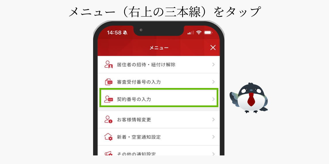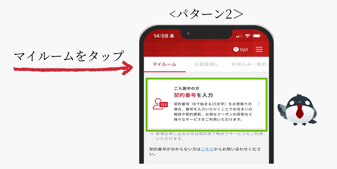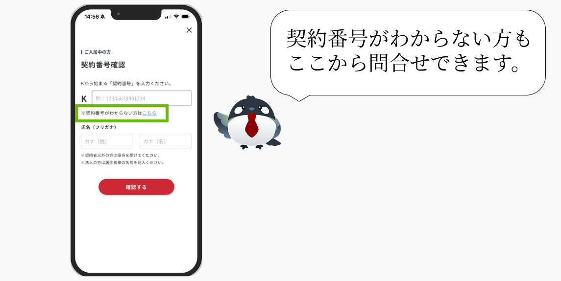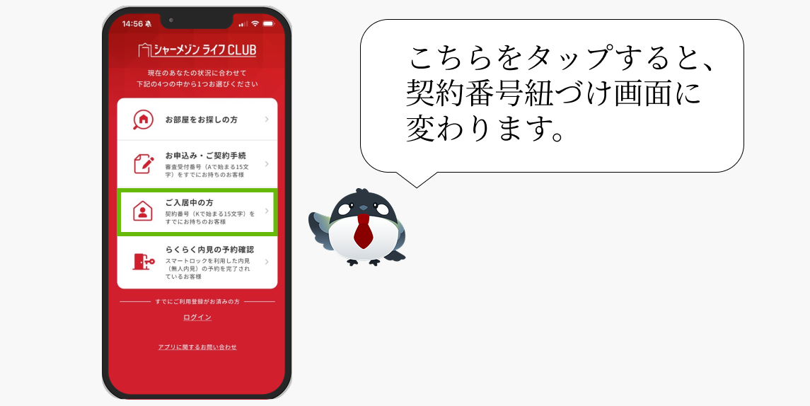 トップ画面にある「ご入居中の方」というボタンを押すと、そのまま契約番号の紐づけ画面へ進むことができます。