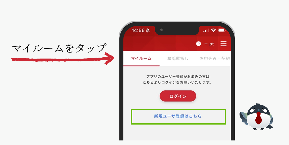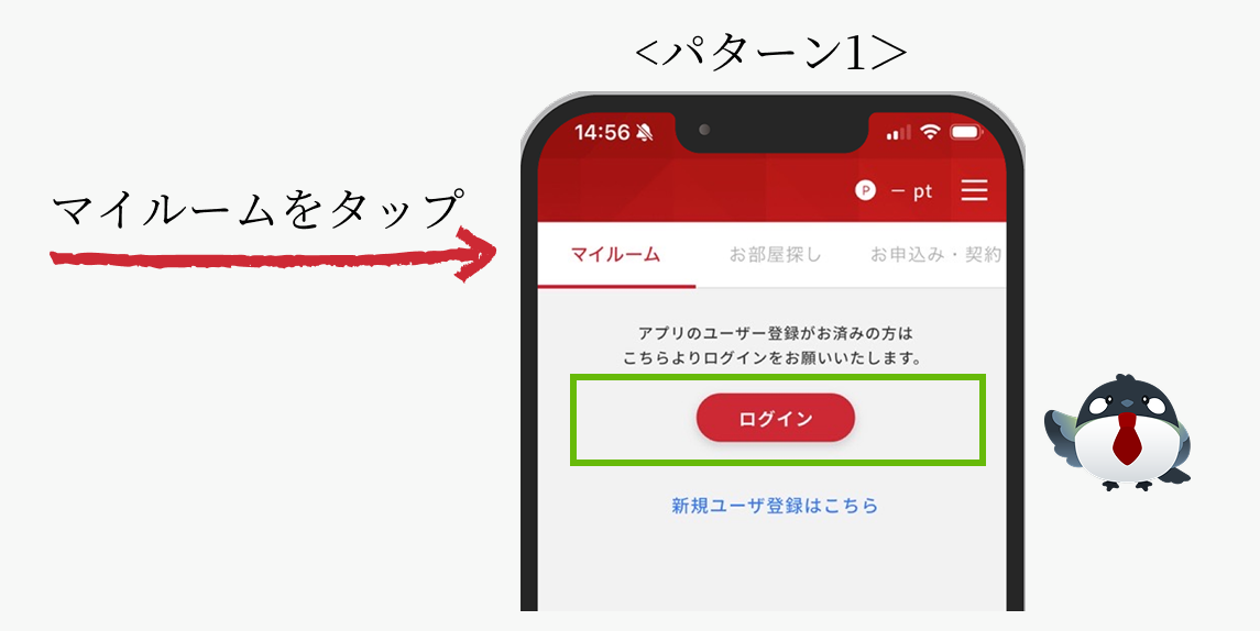 ユーザー登録の案内が表示された場合は「ログイン」ののち、もう一度マイルームをタップしてください。